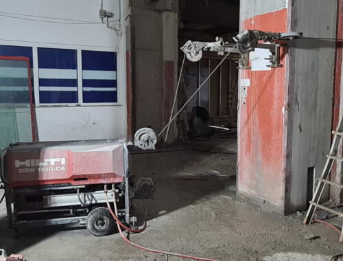 Hier mussten Tor- und Fensteröffnungen mit über einen Meter Dicke in Stahlbeton geschnitten werden. Dazu setzehn wir Seilsägen ein.