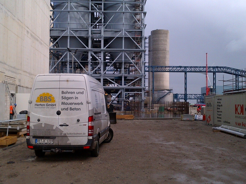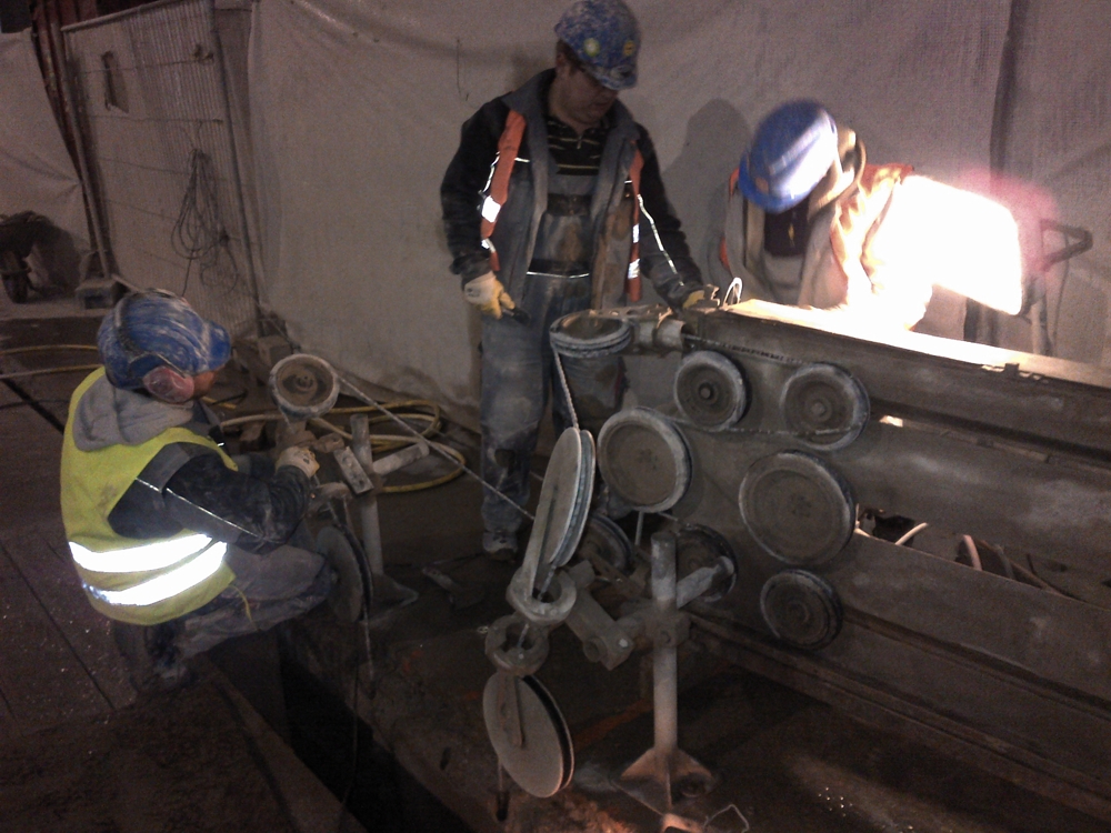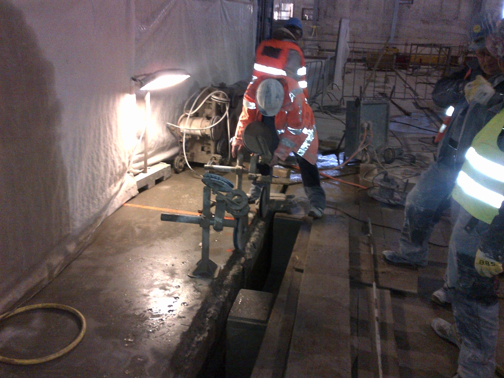 An einem großen Betonelement, frei schwebend auf Fundamenten, dass durch eine Fehlbetonage Verbindung zum Bauwerk hatte, mussten 30 m mal 3 m mittels Seilsägen abgesägt werden.